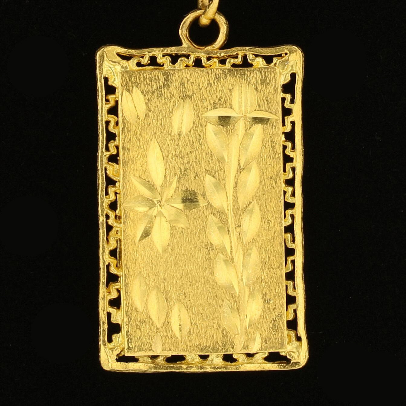 This striking 24K solid gold dragon pendant and chain is a powerful statement piece crafted in pure yellow gold, weighing an impressive 21.6 grams. The rectangular pendant features a high-relief sculpted dragon on the front — a timeless symbol of strength, protection, and prosperity — with exceptional depth and texture that catches the light beautifully. The reverse side is delicately engraved with bamboo, symbolizing longevity, resilience, and harmony. The pendant is framed with an elegant openwork border and hangs from a matching 24K gold chain with a beautifully crafted hook clasp. Rich in symbolism and presence, this is not just jewelry — it is wearable art, investment gold, and a powerful talisman all in one.