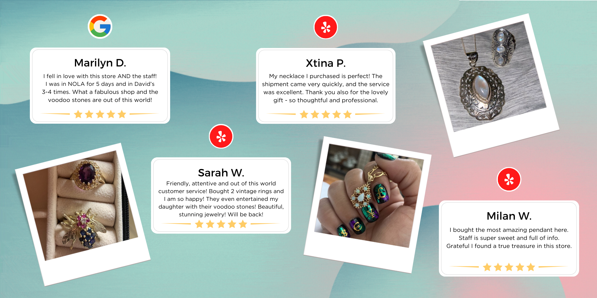 At David’s Antiques & Jewelry, we showcase a curated collection of vintage and antique pieces that capture the artistry and elegance of fine jewelry through the decades. From the geometric beauty of Art Deco rings to the dramatic flair of 1950s cocktail designs, each item tells a story of style, era, and craftsmanship. Located in the heart of New Orleans’ French Quarter, our boutique is home to one-of-a-kind treasures selected for their quality, character, and enduring appeal. Whether it’s a hallmarked brooch or a show-stopping gemstone ring, our pieces speak to collectors, romantics, and anyone drawn to timeless design with a soul.