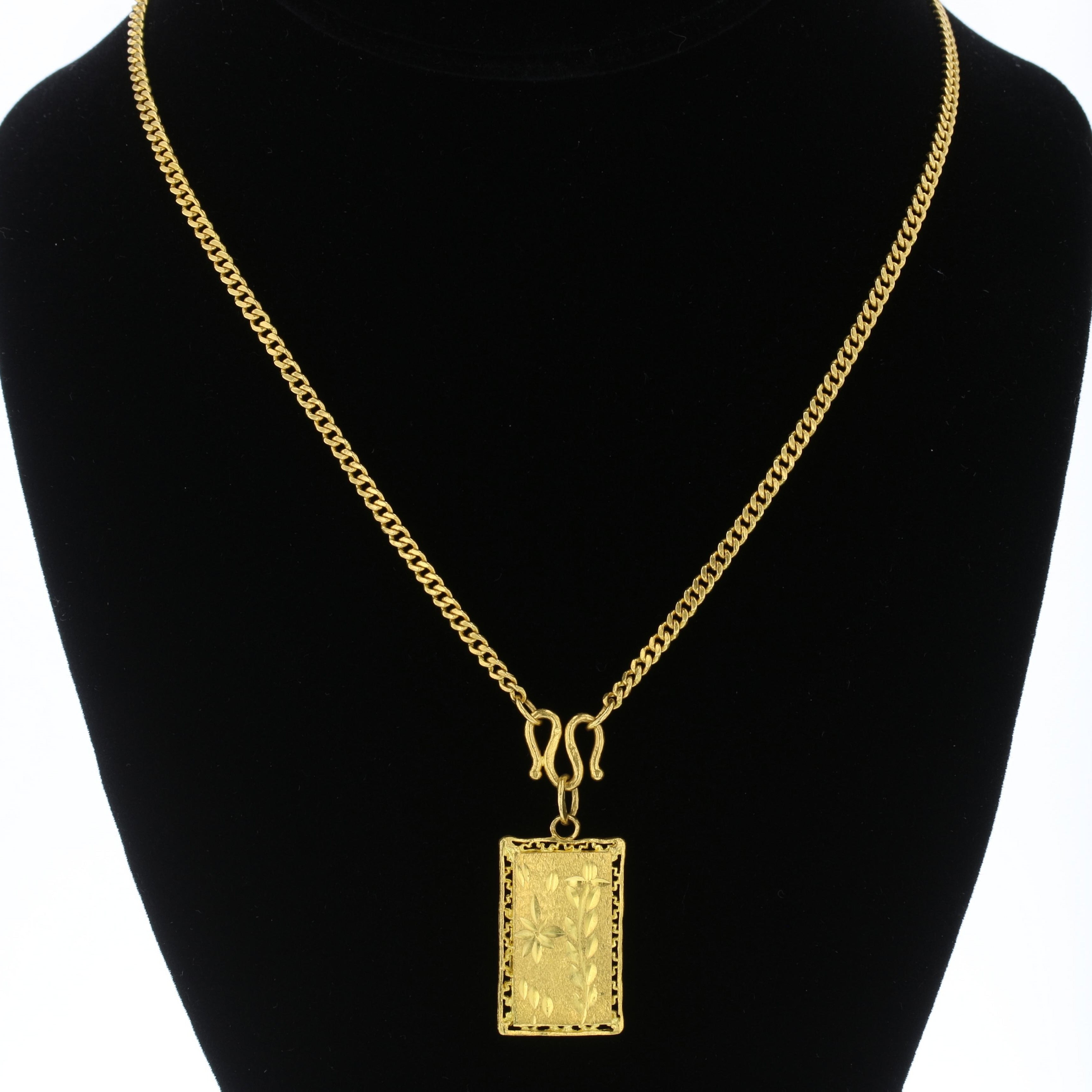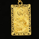 This striking 24K solid gold dragon pendant and chain is a powerful statement piece crafted in pure yellow gold, weighing an impressive 21.6 grams. The rectangular pendant features a high-relief sculpted dragon on the front — a timeless symbol of strength, protection, and prosperity — with exceptional depth and texture that catches the light beautifully. The reverse side is delicately engraved with bamboo, symbolizing longevity, resilience, and harmony. The pendant is framed with an elegant openwork border and hangs from a matching 24K gold chain with a beautifully crafted hook clasp. Rich in symbolism and presence, this is not just jewelry — it is wearable art, investment gold, and a powerful talisman all in one.