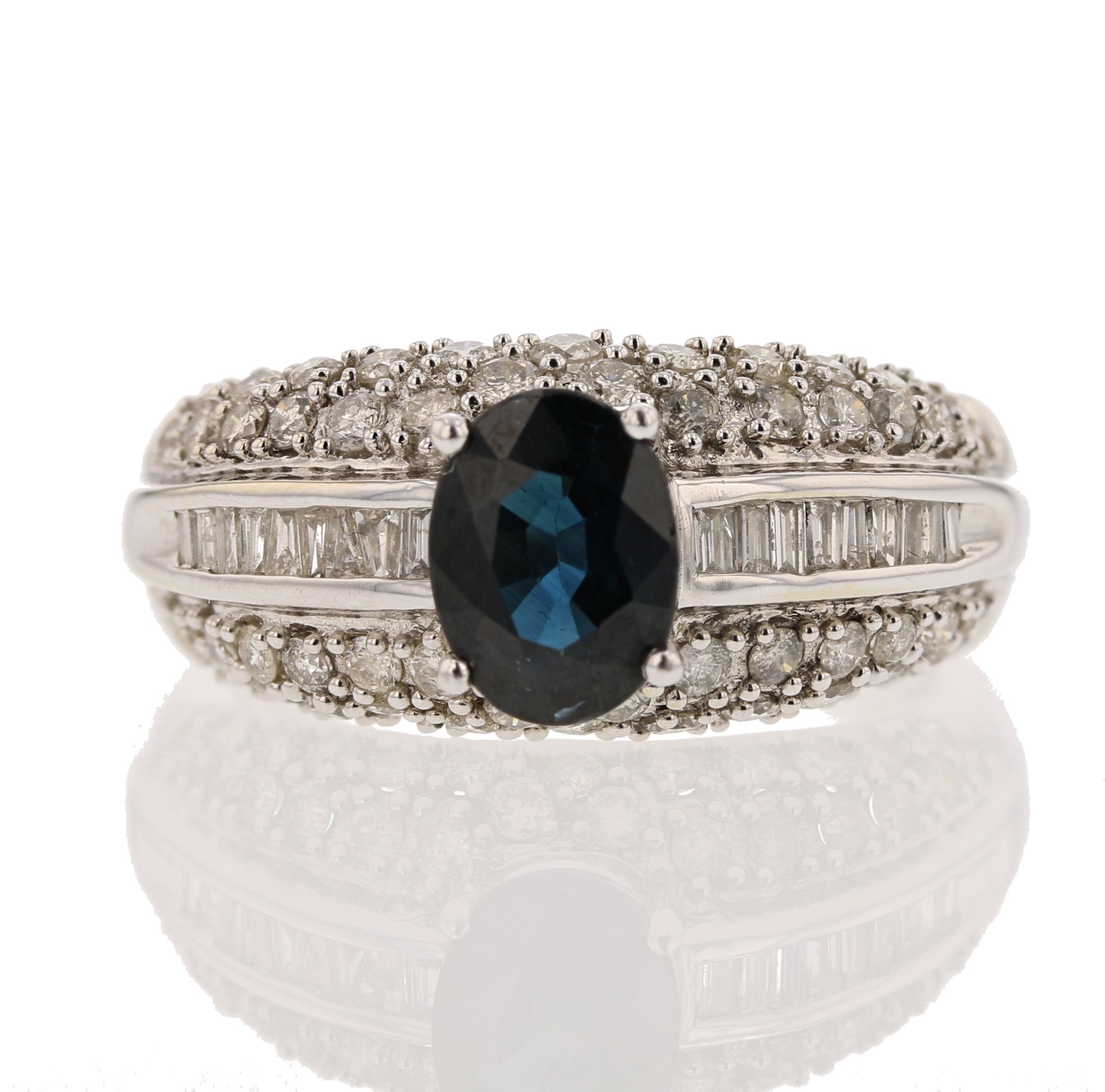 Elegant 14K white gold ring featuring a 1.8ct oval sapphire with pave and baguette diamonds. A luxurious and timeless statement piece.