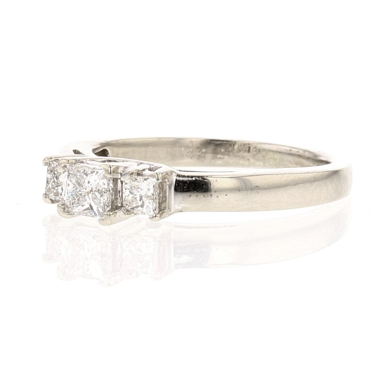 14K white gold three-stone princess cut diamond ring. Elegant and symbolic—perfect for engagements or anniversaries. Item Code: 889195.
