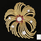Vintage 18K Yellow Gold Miner Cut Diamond Brooch with Ruby Accents