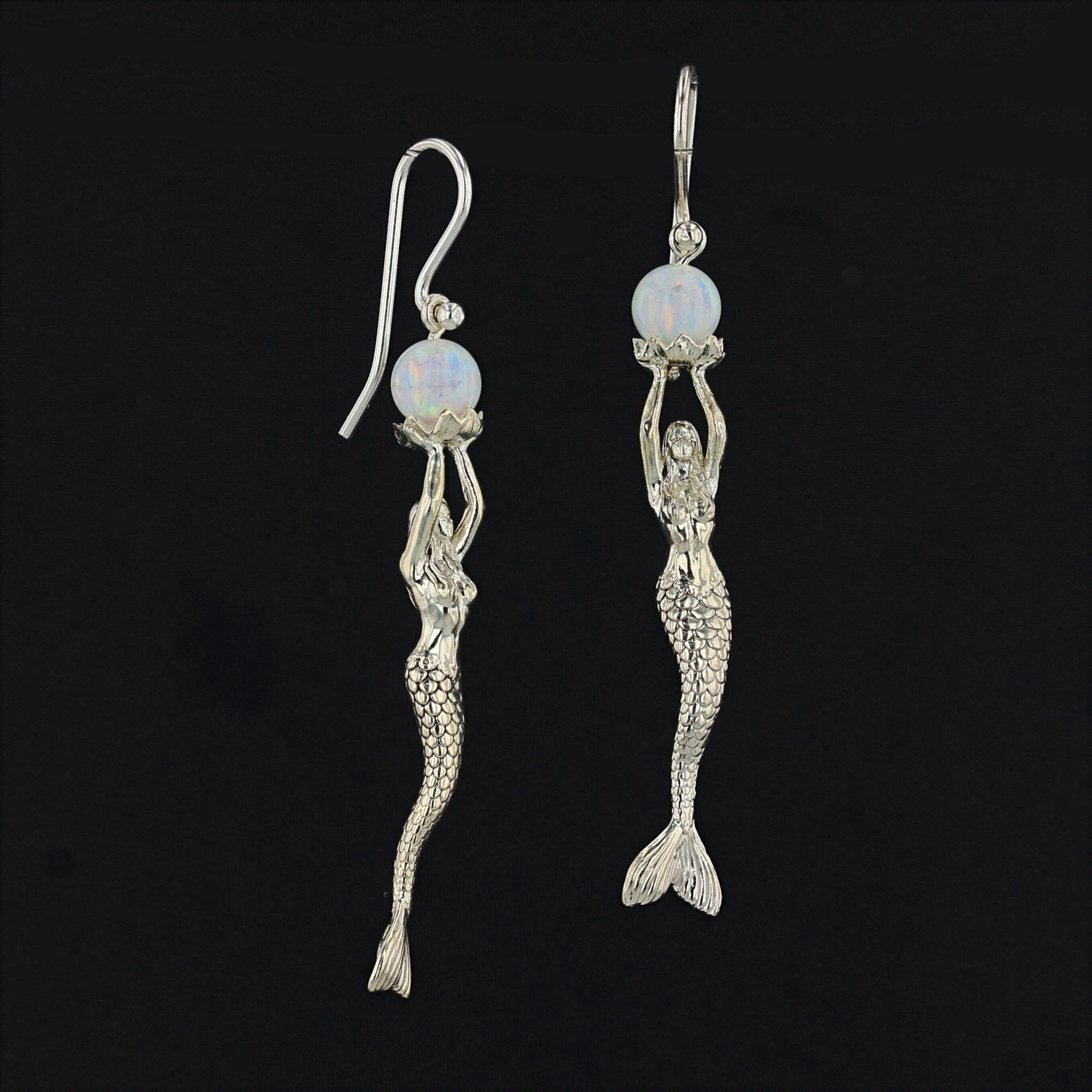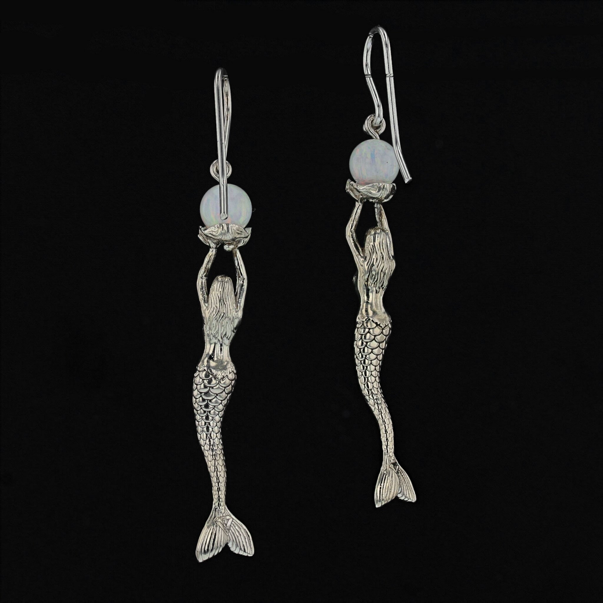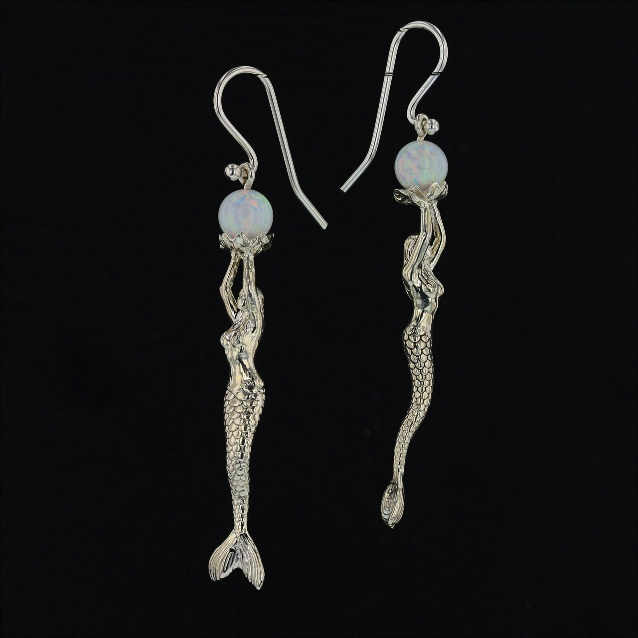 Indulge in the enchanting beauty of these Mermaid Stretching Up High Earrings adorned with a captivating lab-created opal pearl. The mermaid gracefully extends her arms in an offering, holding the opal pearl delicately on an open clam platform. The meticulously detailed face and scales of the mermaid enhance the overall allure of these earrings. Crafted with sterling silver (.925), these earrings are a thoughtful and finished piece of jewelry.