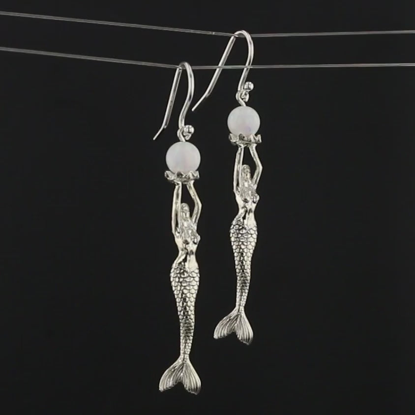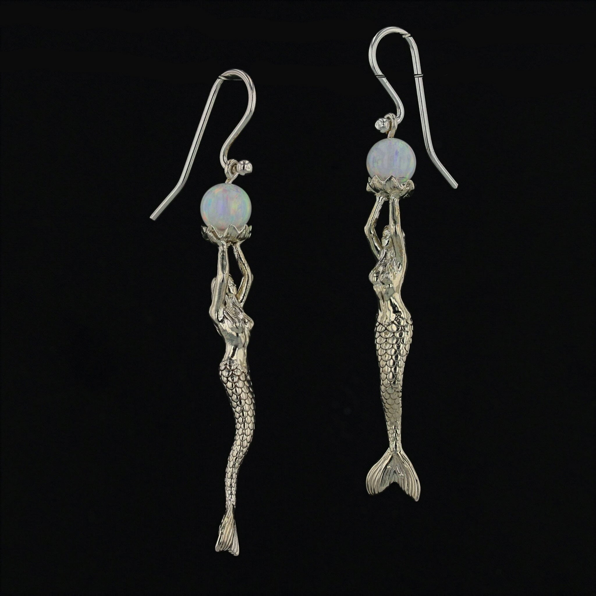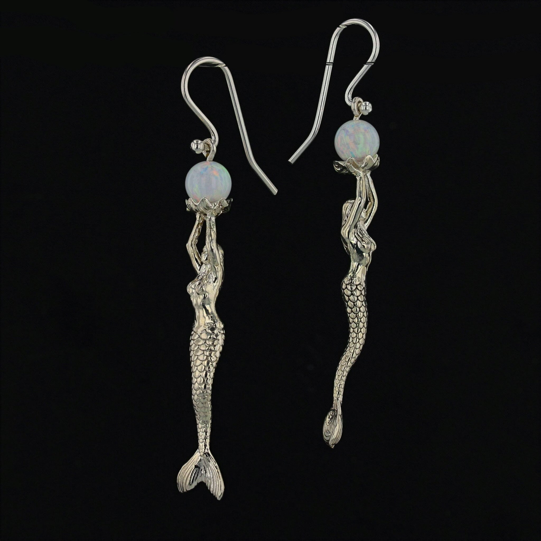 Indulge in the enchanting beauty of these Mermaid Stretching Up High Earrings adorned with a captivating lab-created opal pearl. The mermaid gracefully extends her arms in an offering, holding the opal pearl delicately on an open clam platform. The meticulously detailed face and scales of the mermaid enhance the overall allure of these earrings. Crafted with sterling silver (.925), these earrings are a thoughtful and finished piece of jewelry.