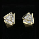 These striking vintage-inspired 14K yellow gold diamond earrings feature a bold, architectural design centered around sparkling trillion-cut diamonds framed by a dramatic fan of baguette diamonds. The sculptural, geometric composition evokes strong Retro and late Art Deco influences, with a luxurious, dimensional build that sits beautifully on the ear. Each earring showcases a 0.21 ct (0.42 ct total) trillion-cut diamond accented by a radiant arrangement of 38 baguette-cut diamonds totaling approximately 1.21 carats. The substantial gold construction and precision channel setting give these earrings a powerful, statement presence while maintaining refined elegance. With their distinctive design, excellent craftsmanship, and timeless appeal, these earrings are perfect for collectors of bold vintage-style jewelry or anyone seeking an unforgettable heirloom-quality pair of diamond earrings.