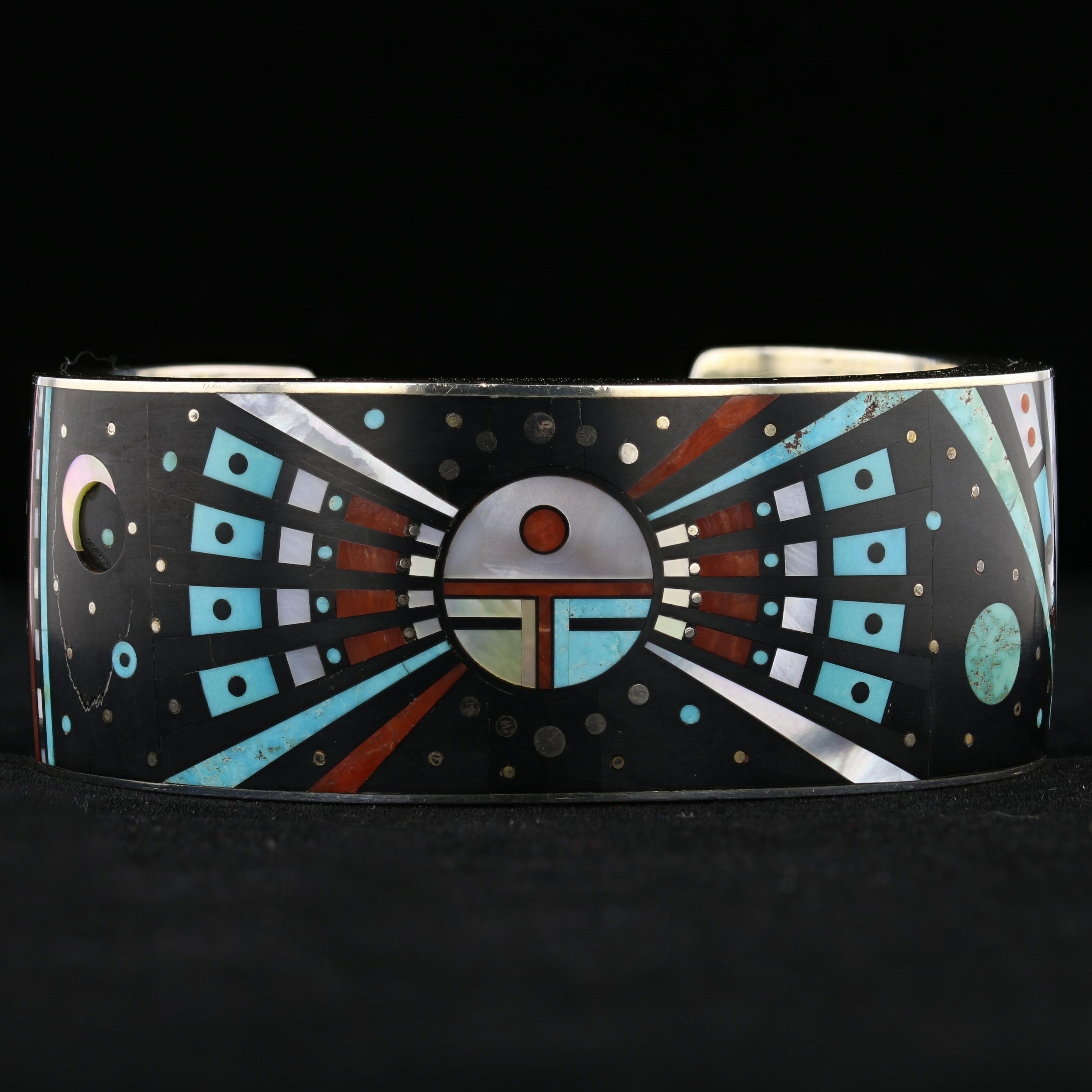 A true masterpiece of Native American artistry, this vintage sterling silver cuff features an intricate micro inlay design, showcasing vibrant turquoise, coral, mother-of-pearl, and jet. Every detail is meticulously handcrafted, creating a mesmerizing cosmic-inspired motif that reflects cultural heritage and fine craftsmanship. Weighing 80.4 grams, this substantial cuff is a one-of-a-kind statement piece, perfect for collectors and those who appreciate unique, handcrafted jewelry.