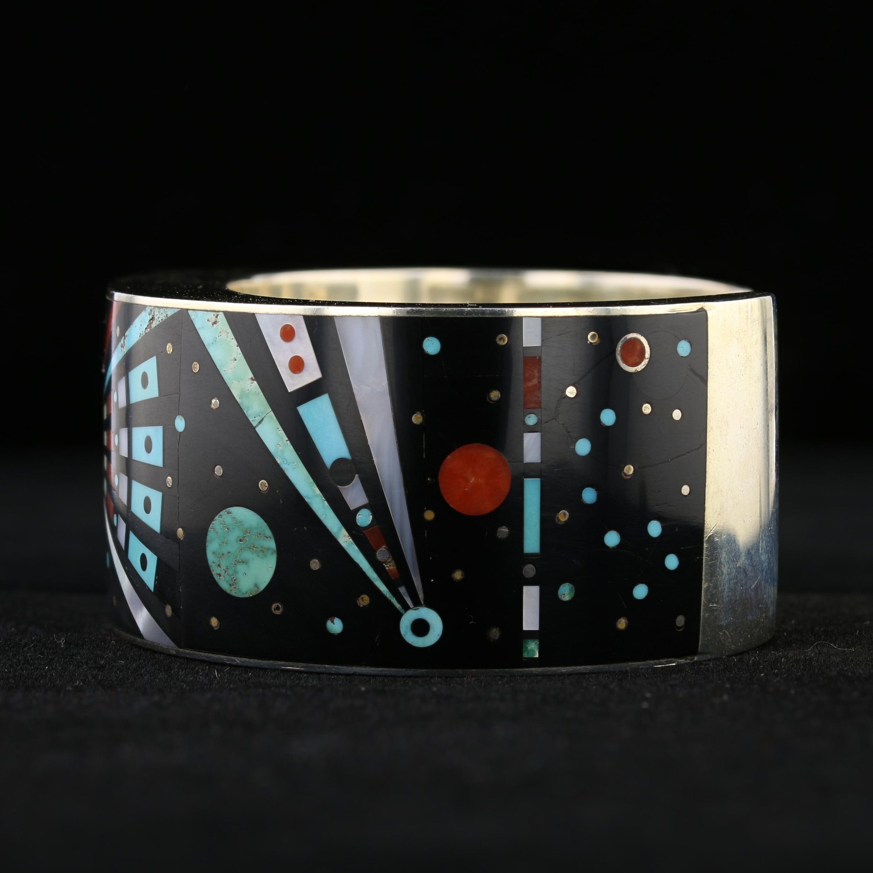 Rare vintage Native American micro inlay cuff in sterling silver (80.4g). Handcrafted with turquoise, coral & jet, featuring a cosmic-inspired design