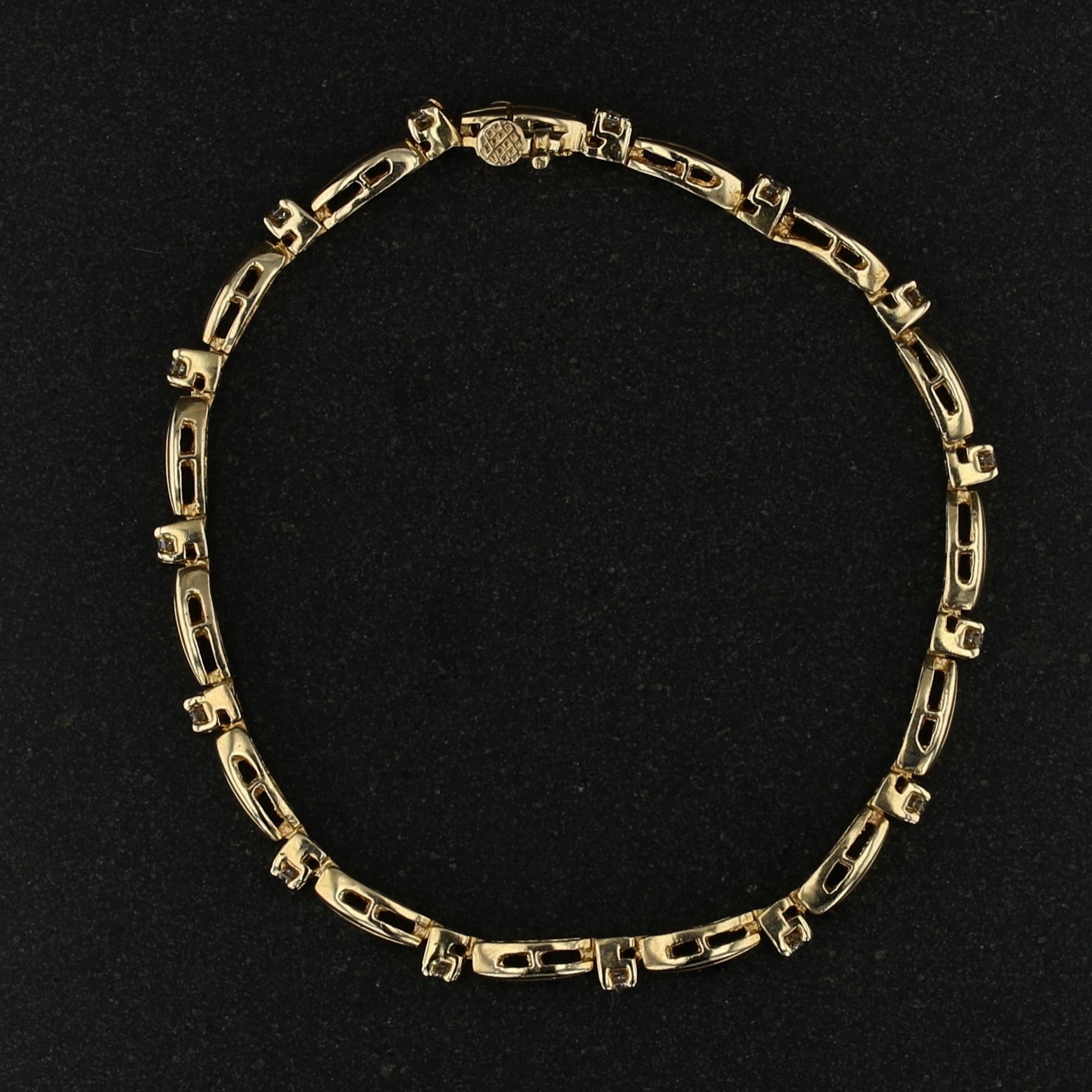 This elegant 14K yellow gold bracelet features a refined ribbed link design interspersed with round brilliant cut diamonds graded J in color, creating a timeless and luxurious look. Weighing 10.97 grams, this contemporary piece draws inspiration from mid-century styling, offering both substance and sophistication. Each diamond is prong-set between the curved gold links, allowing for maximum brilliance while ensuring durability and comfort. Finished with a hidden box clasp and safety latch, this bracelet transitions effortlessly from daywear to evening elegance.