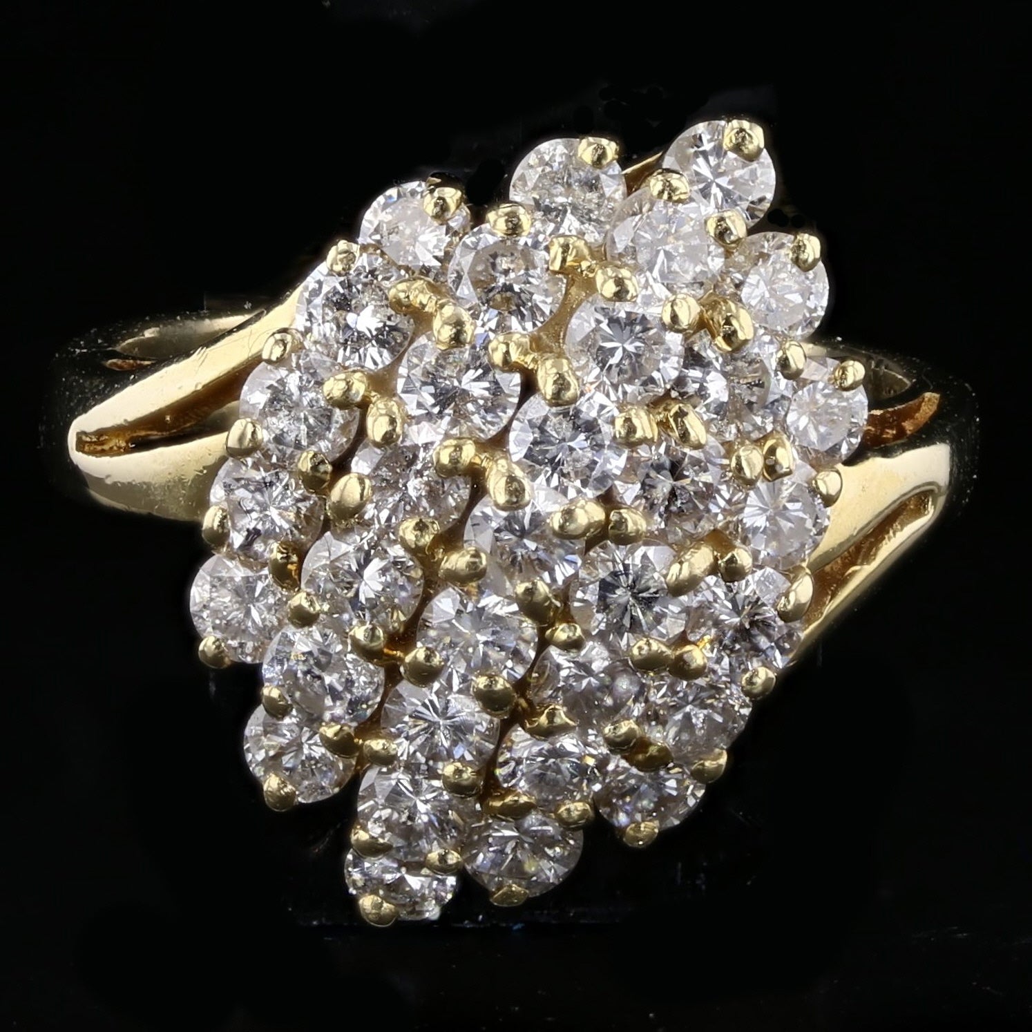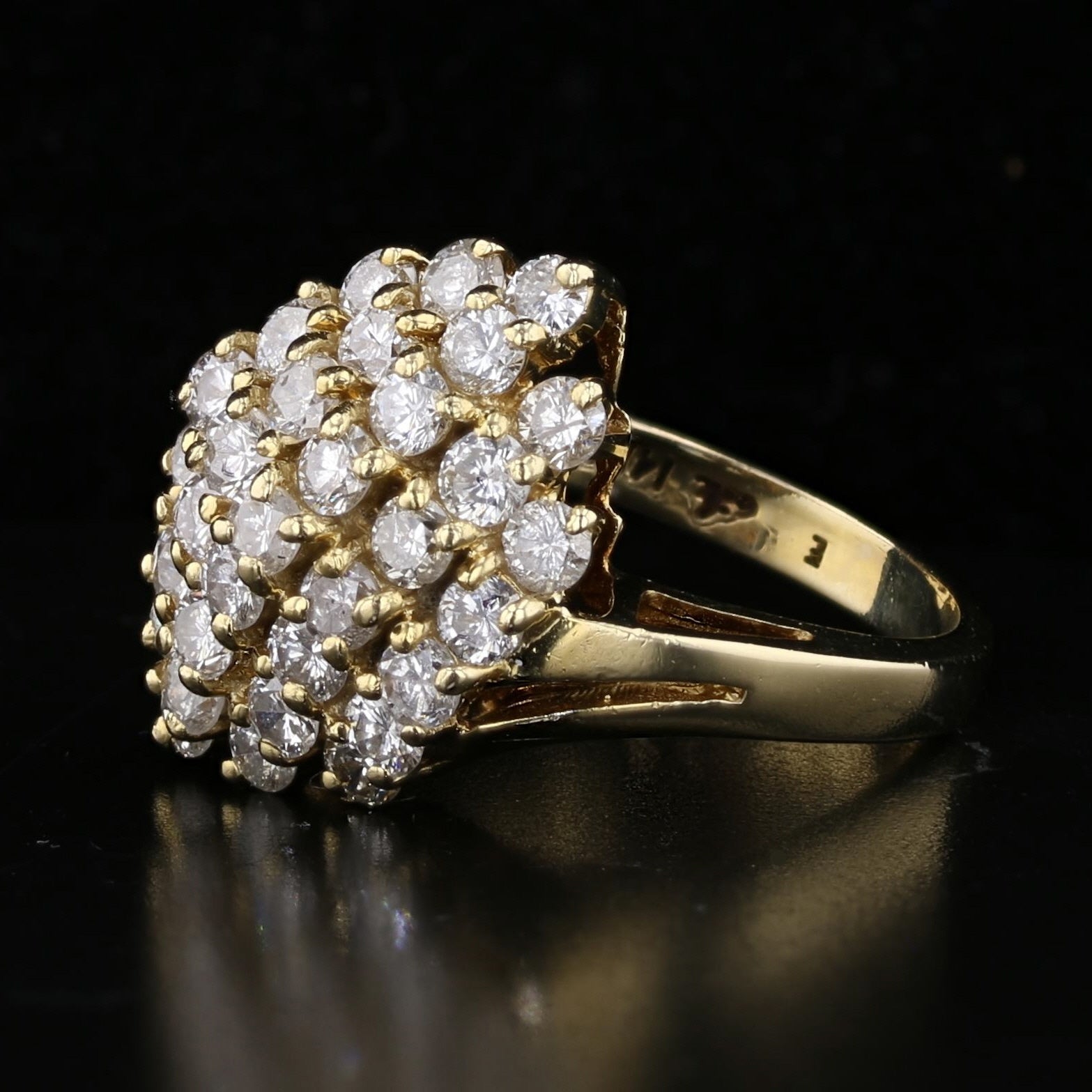 This luxurious vintage 14K yellow gold dinner ring is adorned with 33 sparkling round diamonds, totaling 2.65 carats. Weighing 5.42 grams, these diamonds are graded I-J in color and I1 in clarity, offering an eye-catching and sophisticated sparkle. Ideal for formal events or adding glamour to any outfit, this statement piece is a timeless classic, perfect for those who appreciate vintage beauty and elegance.