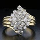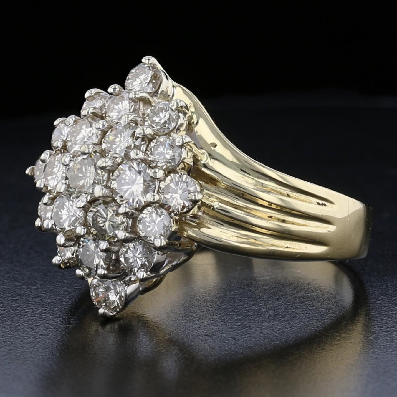 This stunning vintage 14K yellow gold ring features a breathtaking cluster of 21 round diamonds, creating an eye-catching centerpiece. Weighing 8.12 grams, this piece offers a total diamond weight of 2.25 carats, with diamonds graded I in color and SI2 in clarity. The diamonds, ranging from 2.3 to 2.9mm, are arranged in a dazzling cluster design that adds sophistication and sparkle to any look. A timeless treasure, this vintage ring is perfect for those who appreciate luxury and elegance.
