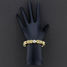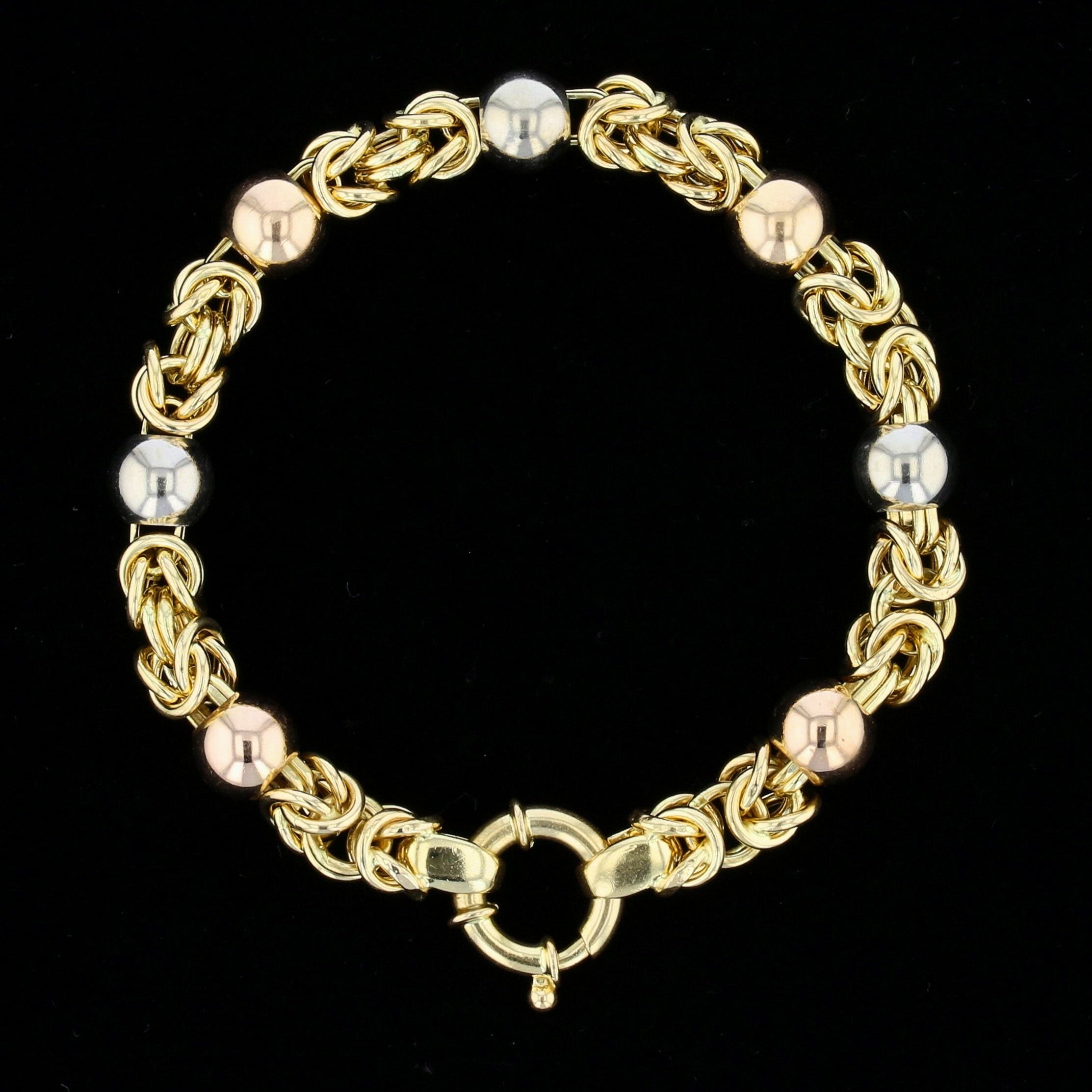Vintage 18K yellow gold Byzantine link bracelet with tri-color gold beads, measuring 8 inches long and weighing 23.4 grams. This elegant bracelet features intricate Byzantine-style woven links in polished 18K yellow gold, accented with contrasting white and rose gold beads for a sophisticated tri-color look. The substantial 23.4-gram weight provides a luxurious feel on the wrist, while the secure oversized spring ring clasp ensures comfortable everyday wear.