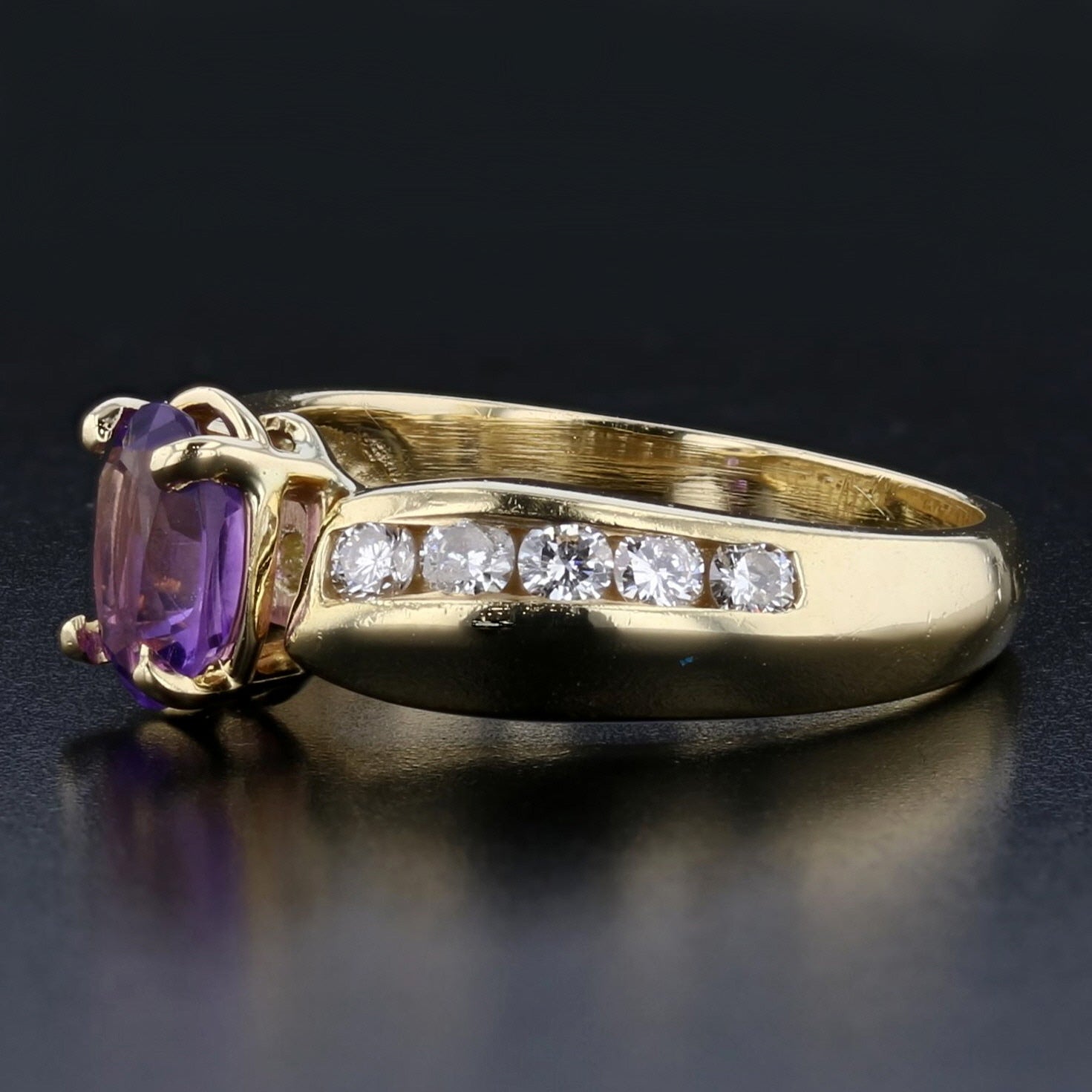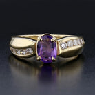 Timeless elegance meets vibrant color in this Vintage Amethyst and Diamond Ring. Crafted in rich yellow gold, the ring features a 7x5mm oval-cut amethyst weighing 0.75 carats, displaying a deep purple hue. Ten round-cut diamonds, totaling 0.40 carats, flank the center stone in channel settings, adding brilliance and contrast. With a graceful silhouette and classic styling, this piece is a versatile addition to any vintage jewelry collection.
