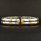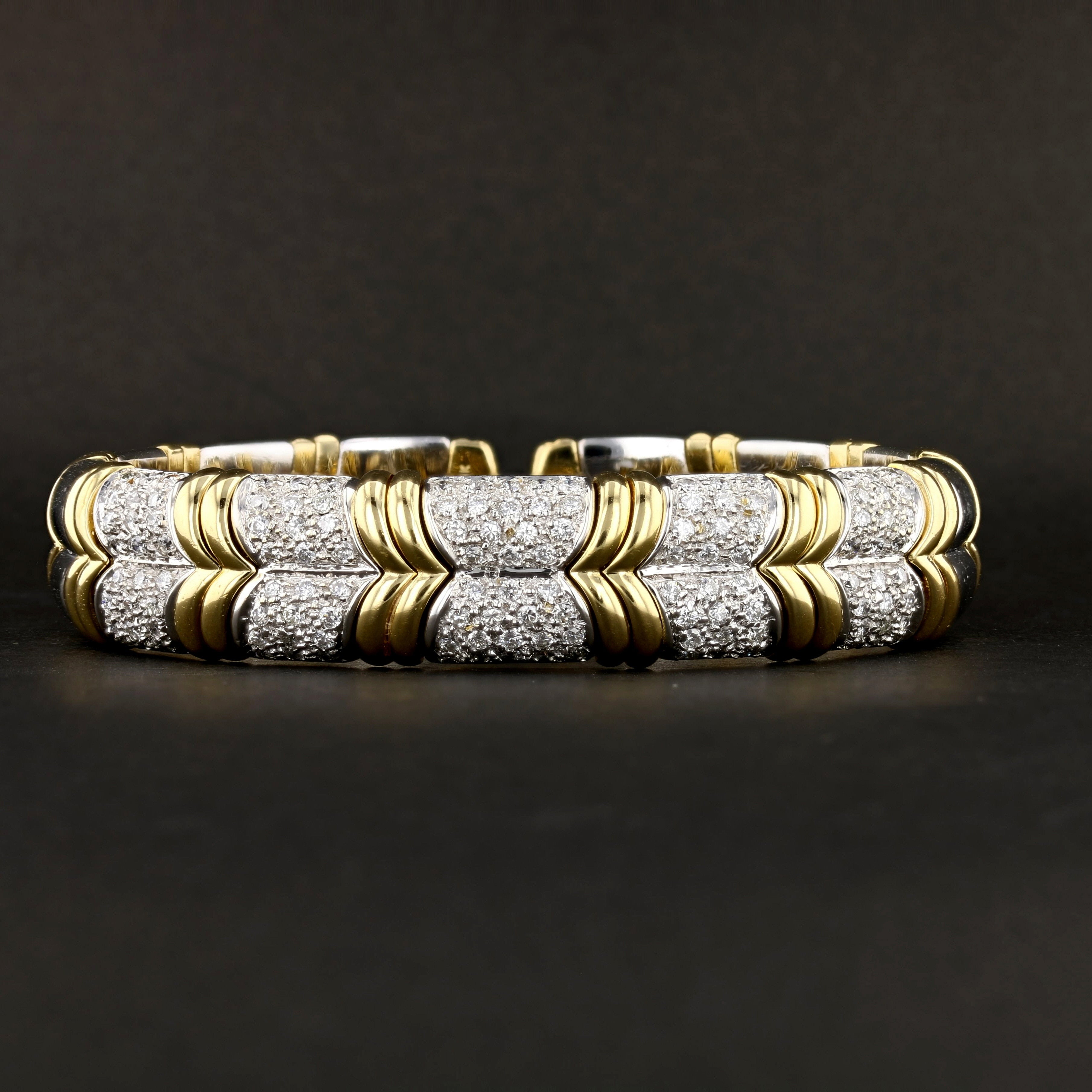 This bold and luxurious vintage bracelet is crafted in rich 18K yellow and white gold, showcasing a striking two-tone segmented design with pavé-set round diamonds. Weighing 53.4 grams, the bracelet features 120 round brilliant cut diamonds totaling approximately 1.2 carats. The diamonds are graded J–K in color and I1 in clarity, offering warm brilliance with vintage character. The geometric styling, paired with screw motif accents and hinged construction, gives this piece a distinctive high-end designer aesthetic. It’s a standout bracelet built for collectors and statement jewelry lovers alike.