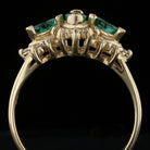 The three marquise-cut emeralds (7x3mm, 4x2mm, 0.4 carats total) are the focal point of the design, radiating a lush green color. Surrounding the emeralds are 20 round diamonds (0.4 carats total, I1 clarity, J-K color), adding a brilliant sparkle that enhances the beauty of the gemstones. The 14K yellow gold setting ties the whole design together, offering a timeless and classic look. This vintage yellow gold emerald and diamond ring is a true statement piece for anyone who loves antique-style jewelry with a modern twist.
