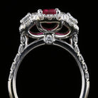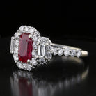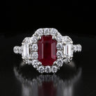 - Unique Features: Emerald-cut ruby with a diamond halo and side emerald-cut diamonds, all set in 18K white gold