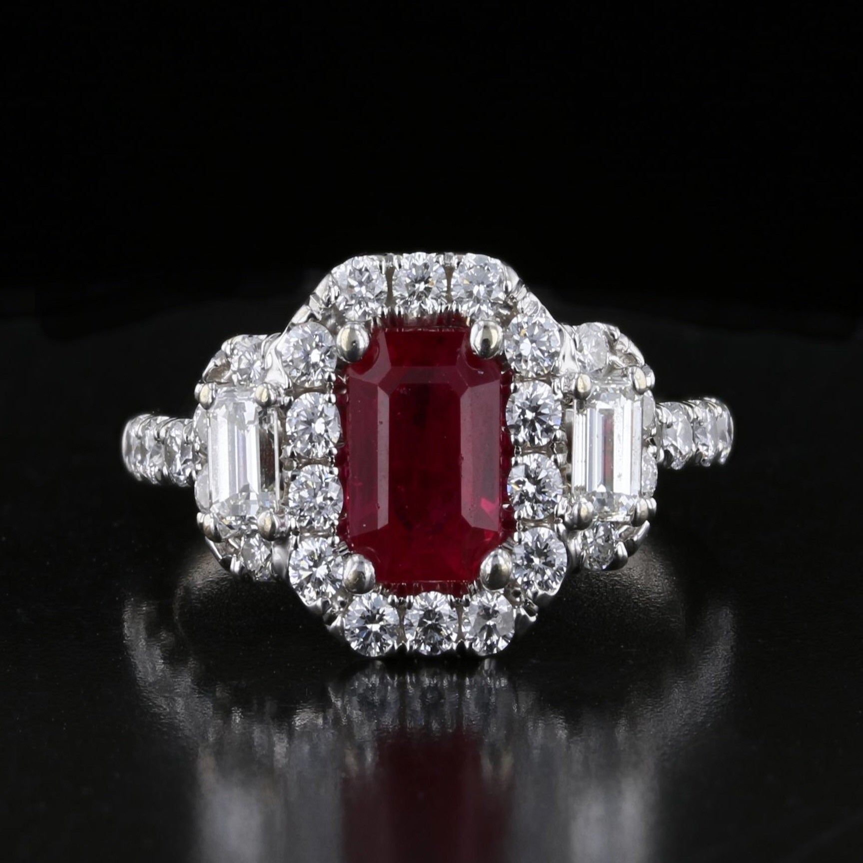 Vintage 18K white gold ring with emerald-cut ruby (0.88ct) and diamond halo (1.36ct), size 5.5. Luxurious and timeless elegance. Item code 893622.