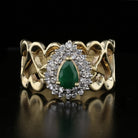 This stunning vintage ring features a vibrant pear-shaped emerald, encircled by a halo of sparkling diamonds, all set in luxurious 14K yellow gold. The openwork design adds a unique touch, allowing light to enhance the luster of the stones. With its exquisite craftsmanship and eye-catching combination of emerald and diamonds, this ring is a true statement piece, perfect for those who appreciate timeless elegance and unique vintage style.