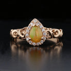 Fire opal and diamond halo ring in 14K rose gold. Features a 0.6ct pear-shaped opal with 0.12ct diamonds. Perfect for special occasions.