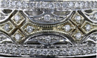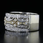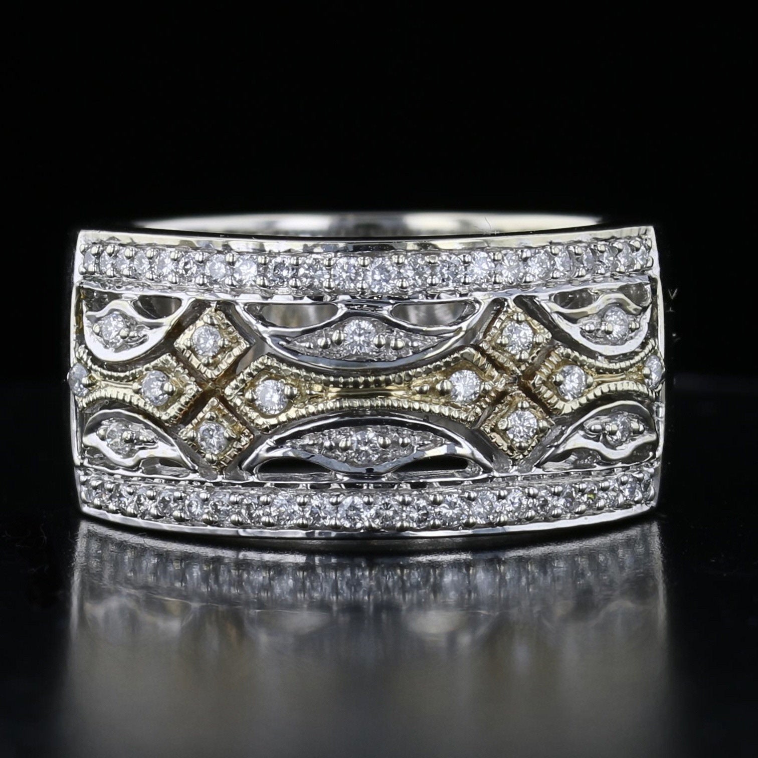 This elegant vintage diamond band ring features 60 sparkling round-cut diamonds (0.6ct total weight, J color, I1 clarity) intricately set in a detailed white gold design. Weighing 9.1 grams, this size 7 ring showcases ornate craftsmanship with milgrain accents and geometric patterns, creating a timeless and sophisticated look.