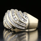 This exquisite vintage ring features a flowing wave design adorned with 52 baguette-cut diamonds (2.35ct total weight, J-K color, I1 clarity) and 24 round-cut diamonds (0.84ct total weight, J-K color, I1 clarity). Expertly crafted in 14K yellow gold and weighing 7.4 grams, this size 7 ring offers bold brilliance and timeless sophistication.
