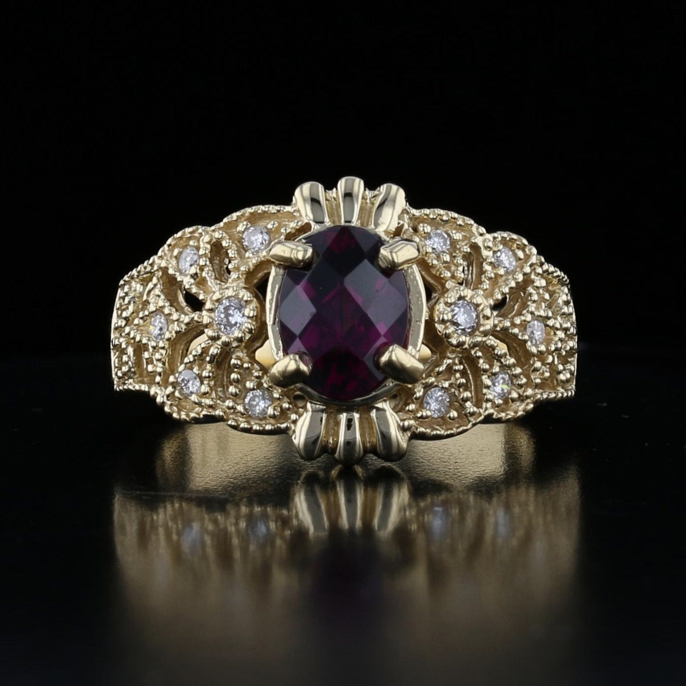 This breathtaking vintage ring showcases a rich 1.2ct oval checkerboard-cut rhodolite garnet (8x6mm), complemented by 12 sparkling round diamonds (0.16ct total, I color, SI2 clarity). Set in 14K yellow gold and weighing 7.2 grams, this size 7 ring features intricate detailing for an elegant, timeless look.
