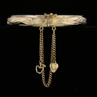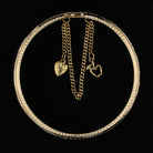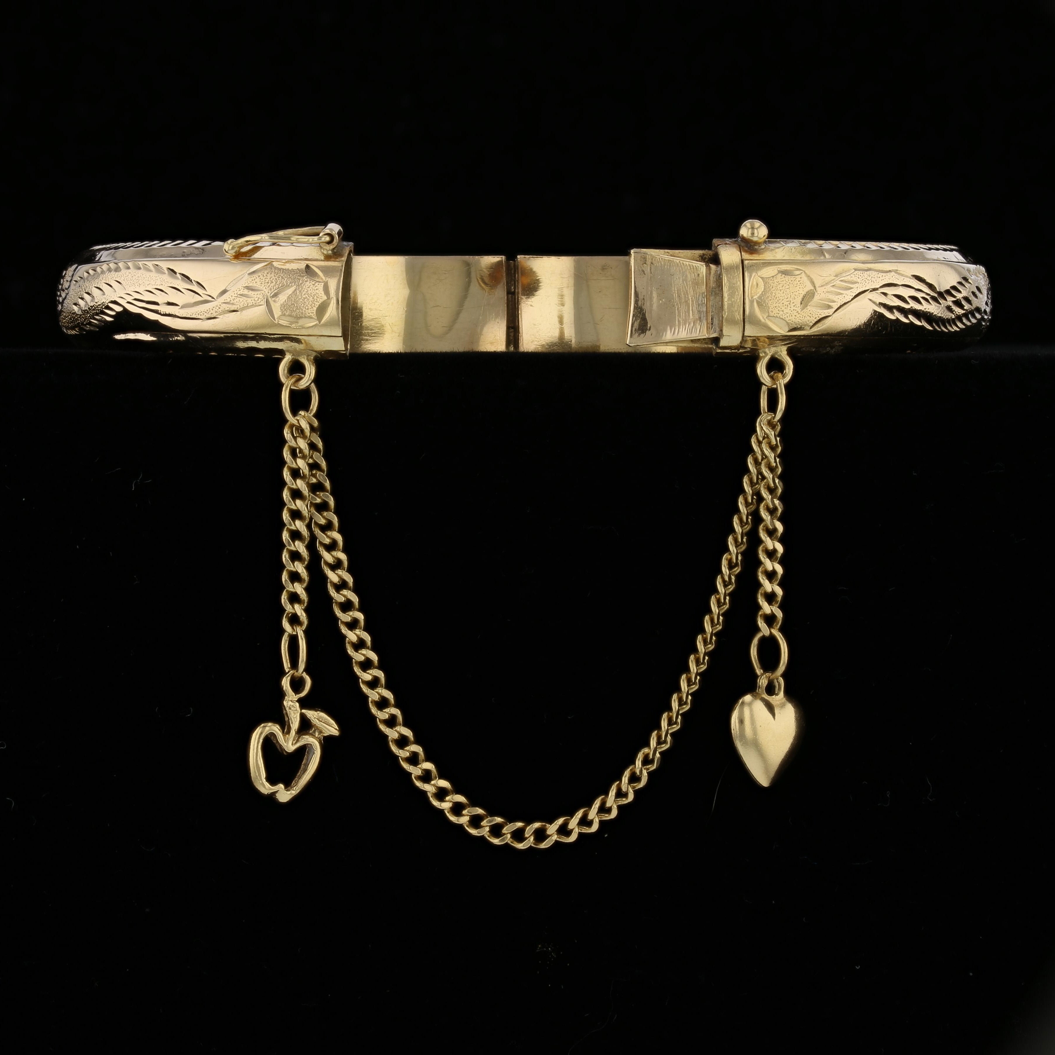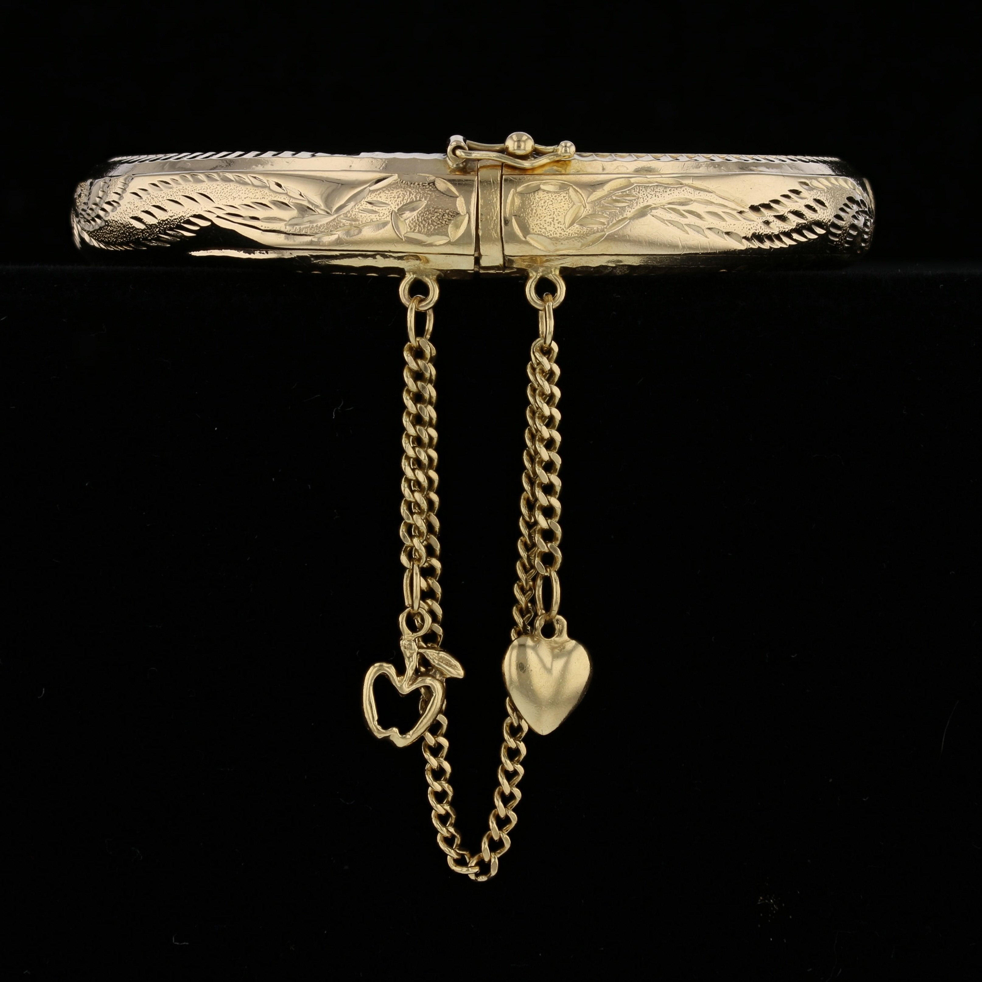 This exquisite vintage bangle is crafted in rich 18K yellow gold, weighing 16.3 grams. The bracelet features a beautifully engraved floral and wave motif along the band, with a safety chain adorned by two whimsical charms – a puffed heart and an openwork apple with leaf detail. The secure clasp ensures a snug fit while the detailed engravings and playful dangles add both character and charm. Whether worn alone or stacked, this heirloom-quality piece blends timeless craftsmanship with unique personality.