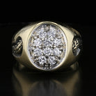 The diamonds (I color, SI1 clarity) are expertly arranged in a pavé-style cluster that creates maximum brilliance and fire. The sculptural shoulders flow seamlessly from the band to the striking oval face, showcasing the refined craftsmanship typical of vintage American jewelry from this era.