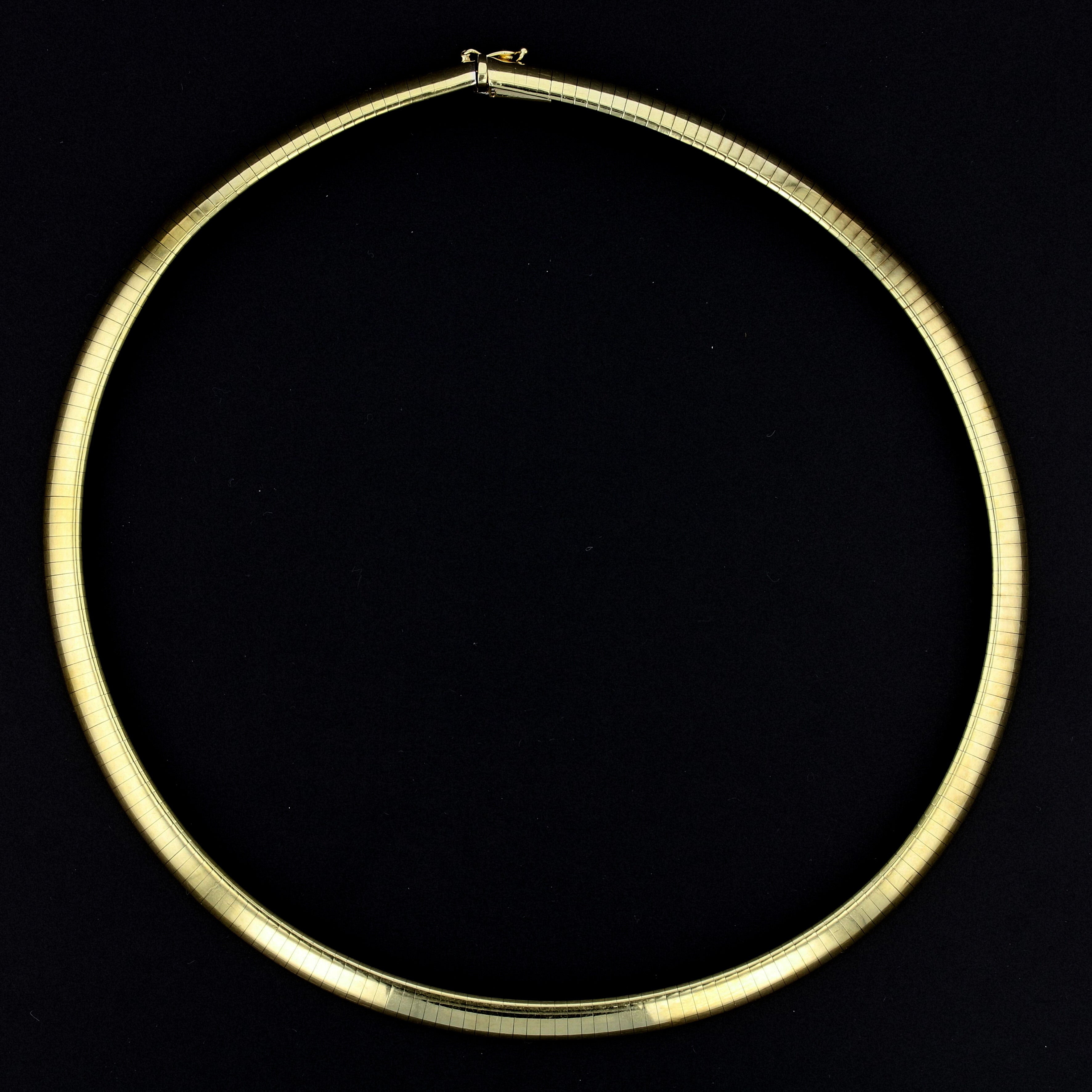 A: An omega necklace features a flat, flexible herringbone design that sits flat against the neck. The name comes from its resemblance to the Greek letter omega (Ω). This style is known for its smooth, elegant drape and comfortable wear.