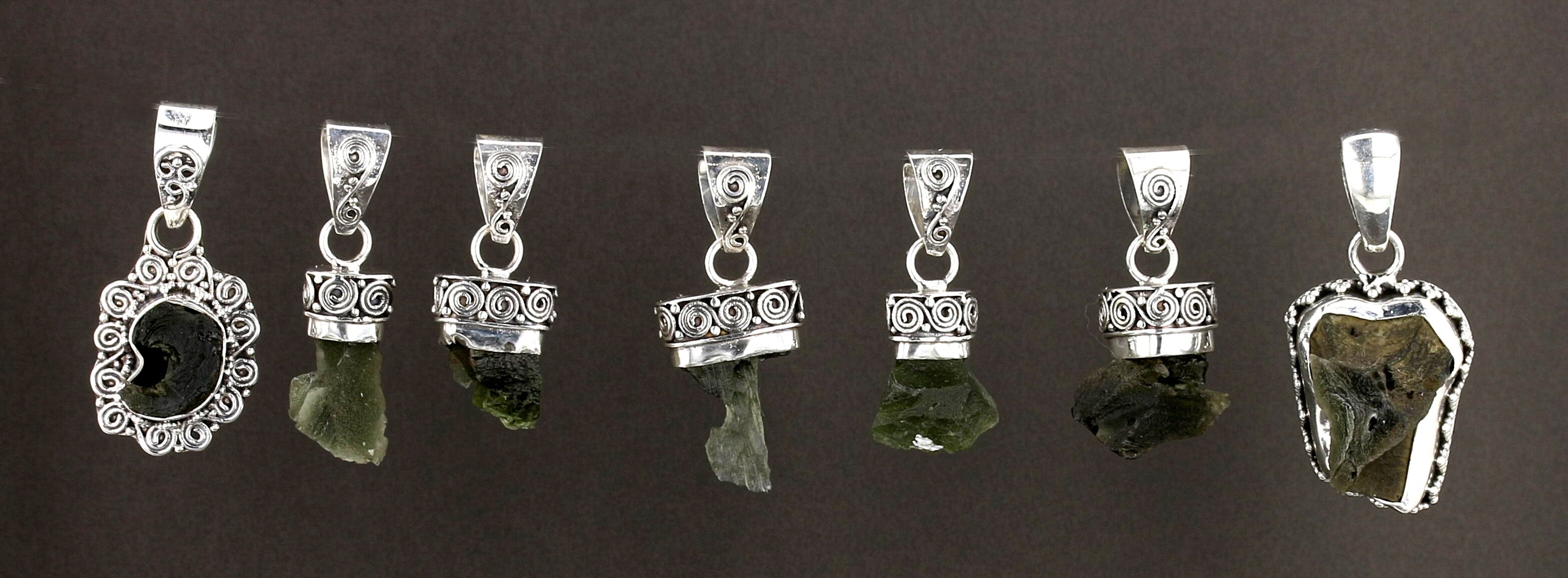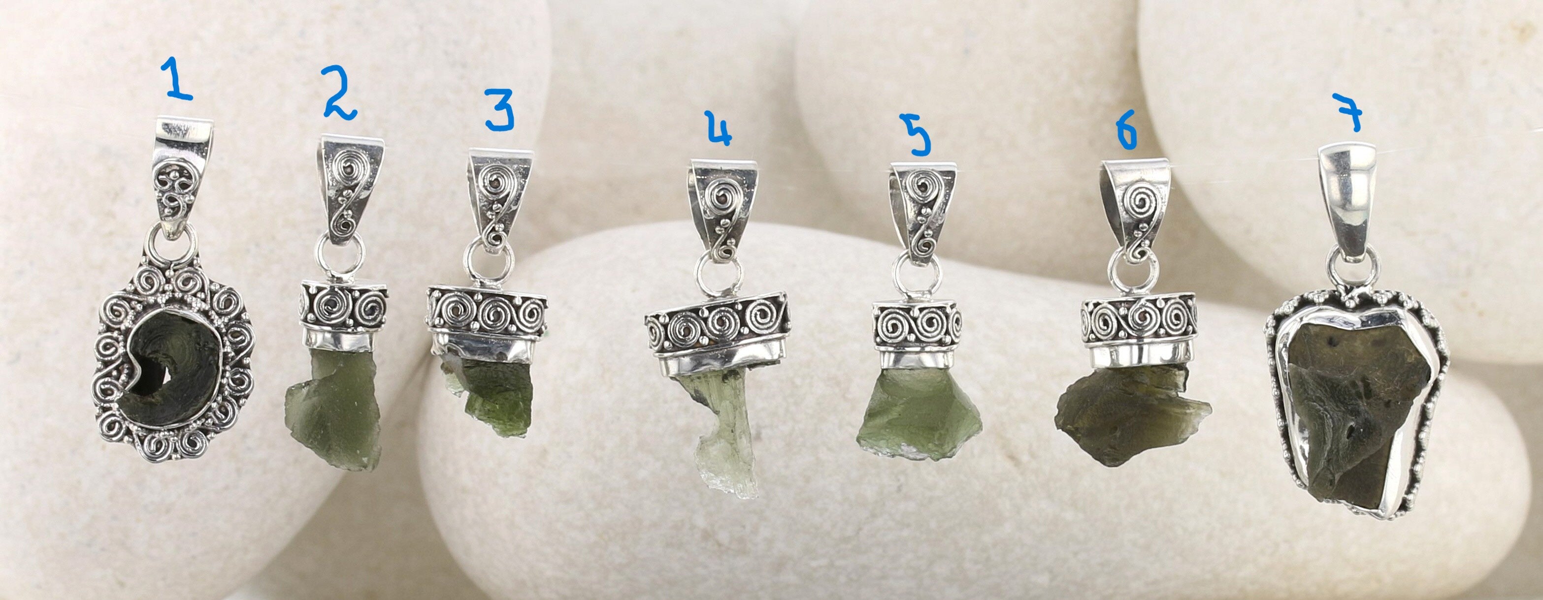 Each pendant is one of a kind, featuring natural, untreated Moldavite — raw or polished depending on the setting — and carefully set in solid silver to honor the stone’s cosmic origin.
