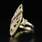 Antique 14K gold navette ring with rubies (0.20ct) & diamonds (0.48ct). Elegant openwork vintage design. 3.9g. Item Code: 892695.