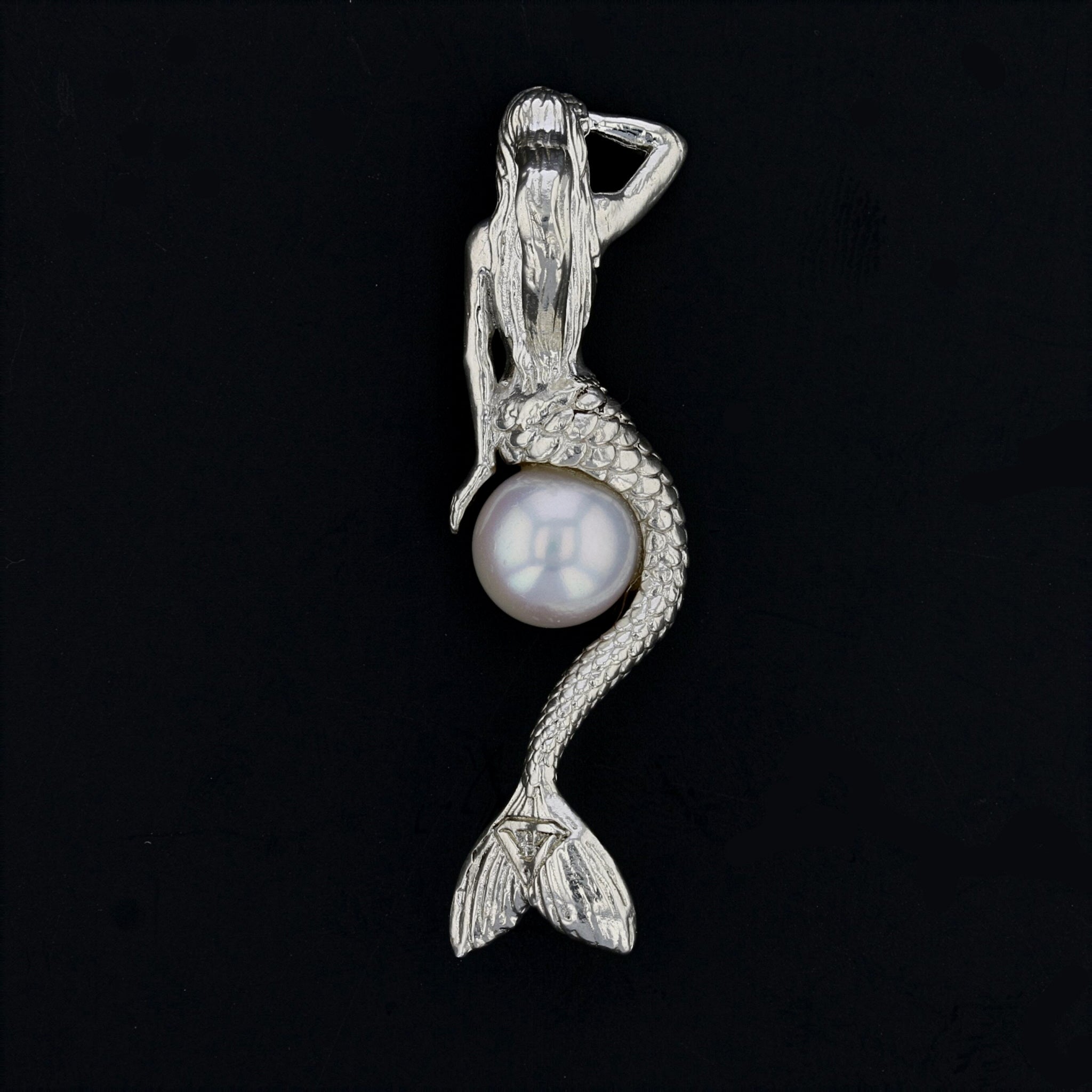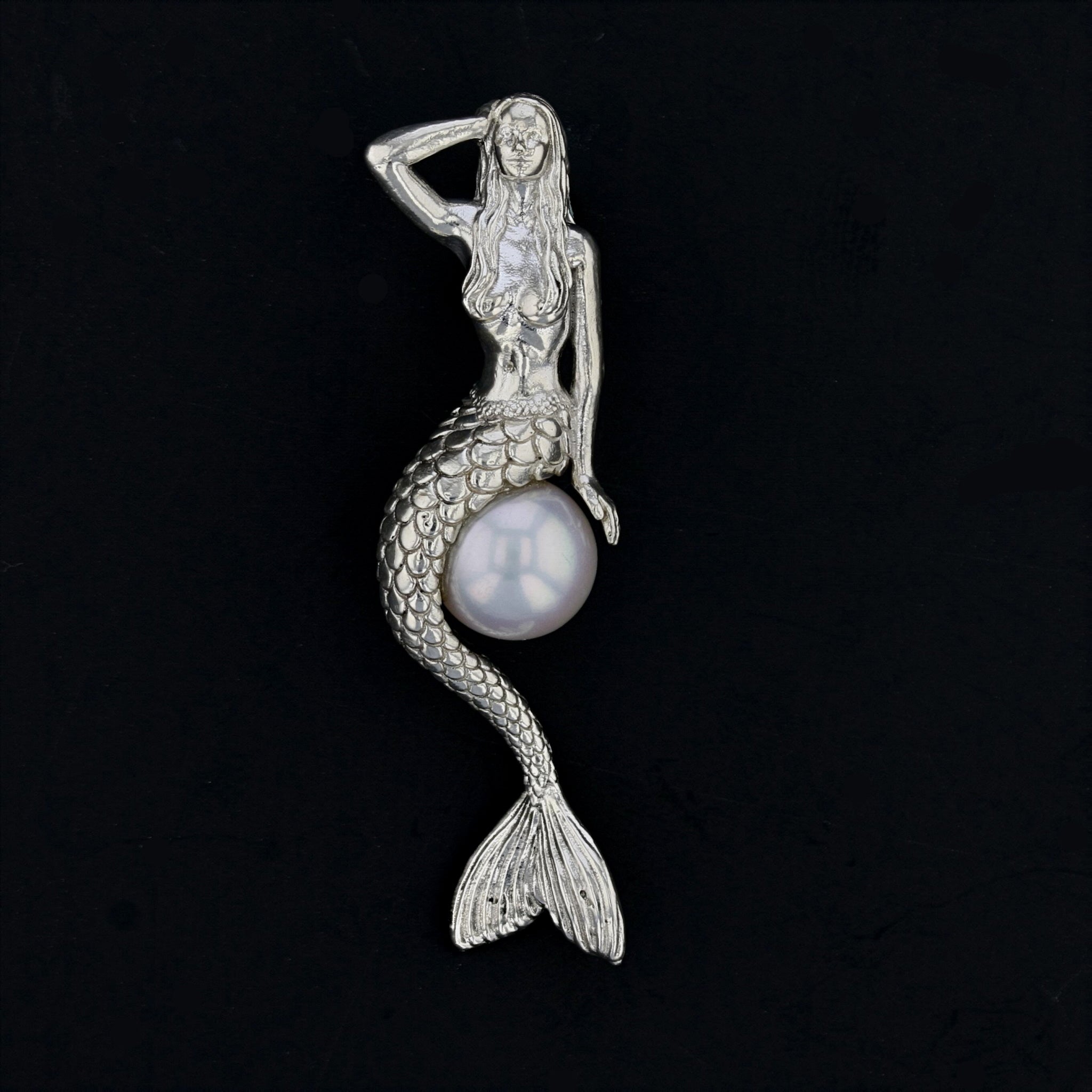 Experience the enchantment of our Mermaid Pendant gracefully seated on a large, round and ultra lusterous Fresh Water pearl. With one hand resting on her head and the other gently placed on the pearl, this pendant captivates with its intricate design. Crafted with sterling silver (.925), the pendant measures 42mm (1.75 inches) and features a cohesive bail with a 6mm opening. The pearl, measuring 9mm, adds a touch of magic to this sterling silver masterpiece.