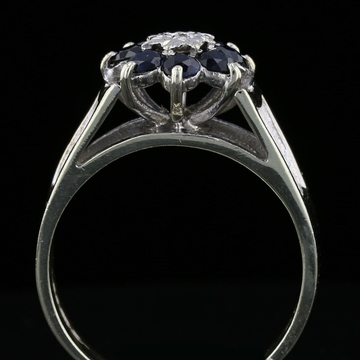This elegant Vintage Sapphire Diamond Ring, crafted in white gold and weighing 5.6 grams, is the perfect blend of sophistication and timeless beauty. Featuring eight round blue sapphires with a total weight of 0.48 carats, this ring is centered with a single round diamond (0.03 carats), creating a delicate floral-inspired design. A stunning piece for vintage jewelry enthusiasts who love classic elegance.