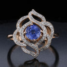 The center Ceylon sapphire (6mm, 0.85 carats) radiates a vivid blue hue, known for its brilliance and rarity. Surrounding the sapphire are 72 round diamonds (0.7 carats total, SI3 clarity, J-K color), adding a dazzling sparkle to the intricate design. The warmth of the 14K rose gold complements the rich blue of the sapphire, making this ring a true statement piece. Whether you're searching for a vintage-inspired engagement ring or a standout accessory, this vintage rose gold sapphire ring is sure to impress.