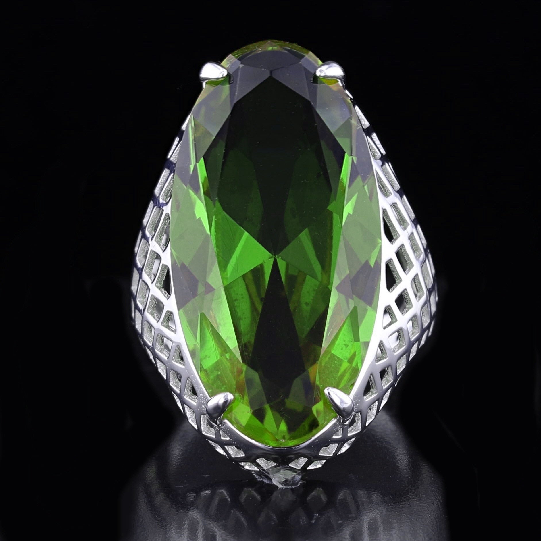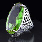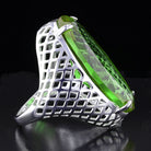 Bold sterling silver VooDoo Stone ring with a gothic-inspired lattice design. A unique statement piece with a dramatic, deep green center stone.