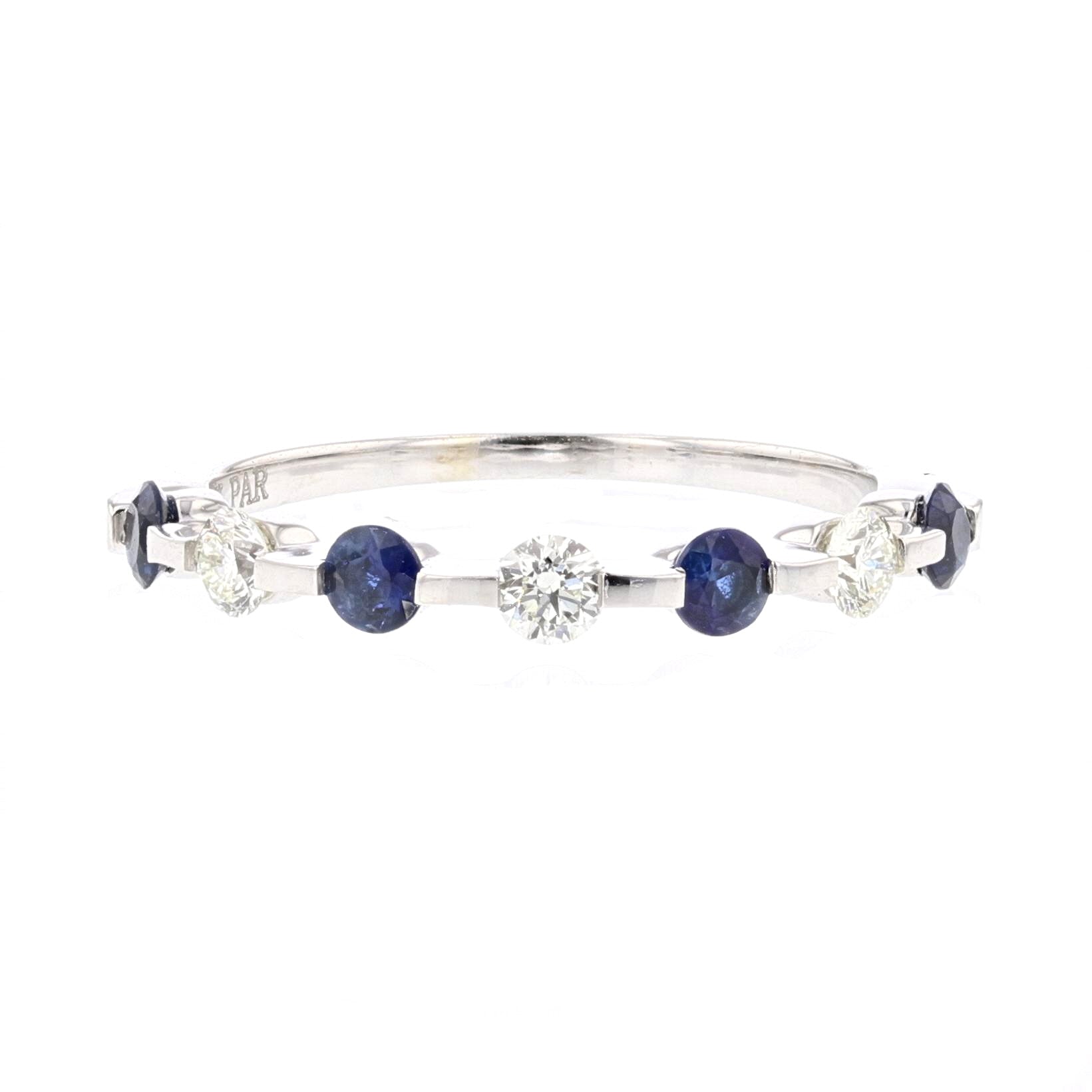 Delicate yet striking, this 14K white gold band features alternating round-cut blue sapphires and brilliant diamonds, creating an elegant contrast. Perfect for stacking, wearing as a wedding band, or adding a touch of sparkle to any outfit.